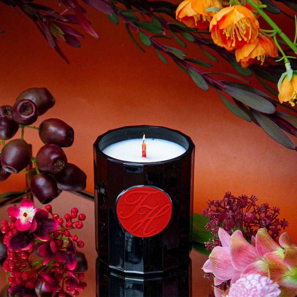 アイコニックな赤いキャンドル芯に高級感あるブラックグラスはギフトにもお勧めのデザイン。