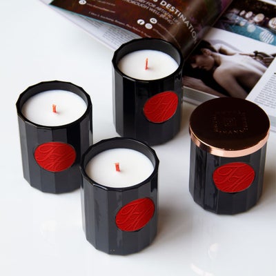 高級感のあるブラックグラスにアイコニックな赤いキャンドル芯のアロマティックキャンドルの選べるeギフト