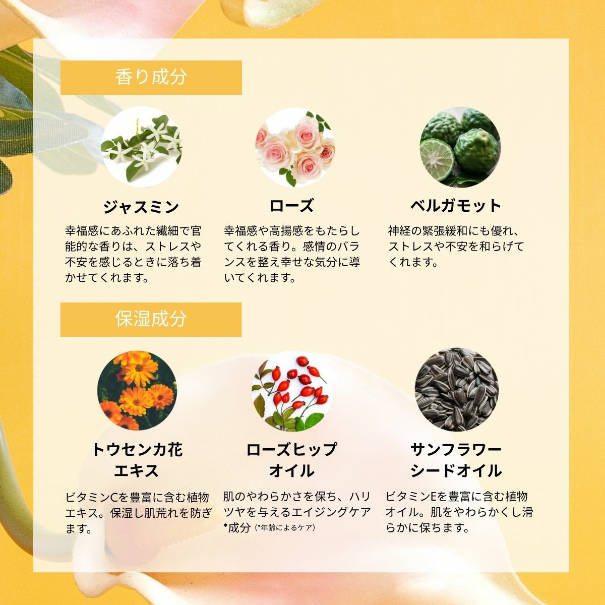 トリ(カプリル酸/カプリン酸)グリセリル、(カプリル酸/カプリン酸)ヤシアルキル、フタル酸ジエチル、香料、ヒマワリ種子油、ホホバ種子油、ミリスチン酸イソプロピル、トウキンセンカ花エキス、カニナバラ果実油、エタノール、酢酸トコフェロール、マツリカ花エキス、トコフェロール、ブドウ種子油、ダマスクバラ花エキス、ベルガモット果実油、ダイオウショウ油 商品本体(および外装箱)背面の品質表示ラベルおよびオンラインショップ商品詳細欄に記載されている全成分リストは、一部表記が異なる場合がございますのであらかじめご了承ください。品質向上や国際的な成分名表記方法に準じる等の理由により全成分表示内容が変更される場合があります。 内容量:10ml 付属の植物:エルウッズゴールド