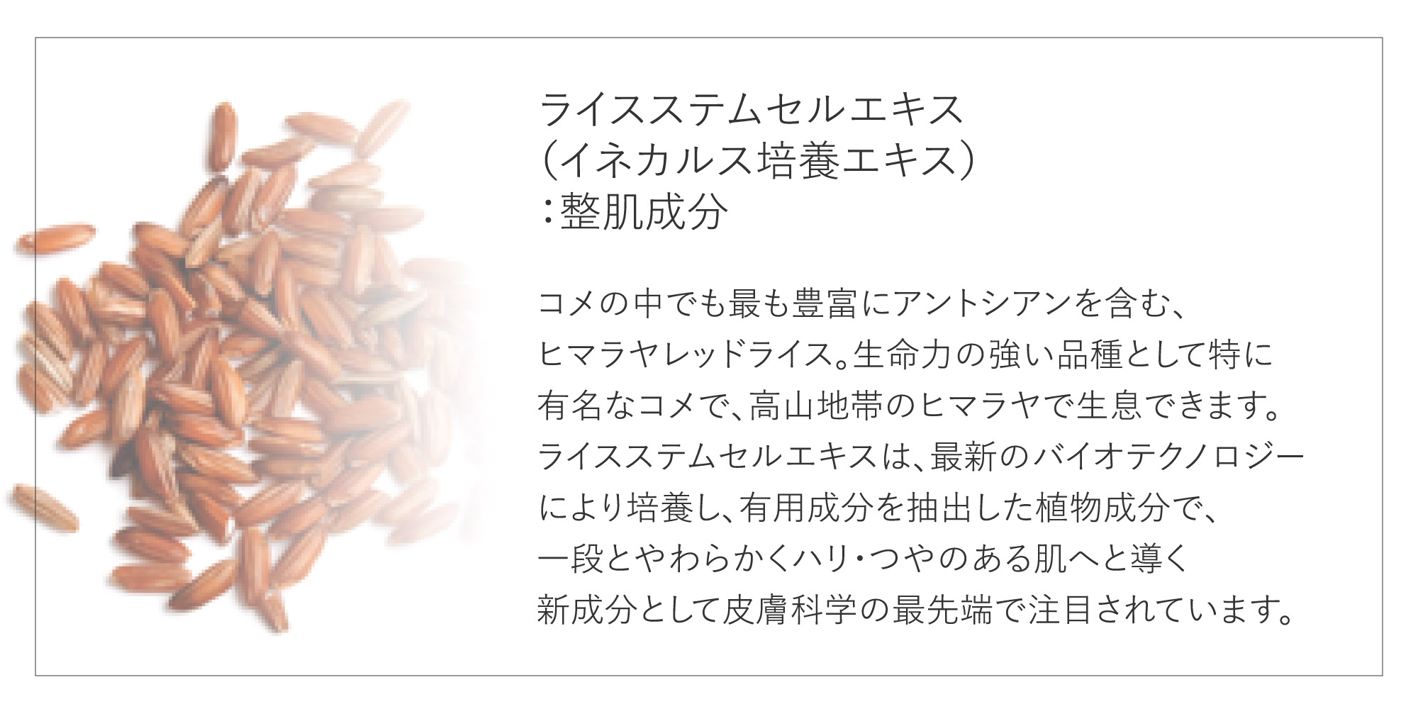 水、コメヌカ油、グリセリン、イソノナン酸イソノニル、ジステアリン酸ポリグリセリル-3メチルグルコース、エチルヘキサン酸セチル、オクテニルコハク酸デンプンAl、ジメチコン、セテアリルアルコール、ステアリルアルコール、ステアリン酸グリセリル、香料、フェノキシエタノール、シア脂、トリ(カプリル酸/カプリン酸)グリセリル、月見草油、イネカルス培養エキス、ステアリン酸PEG-100、カルボマー、カプリリルグリコール、クロルフェネシン、オレンジ果皮エキス、BHT、EDTA-2Na、酢酸トコフェロール、キサンタンガム、水酸化Na、1,2-ヘキサンジオール、コメエキス、ヒアルロン酸Na、ソルビン酸K、安息香酸Na 商品本体(および外装箱)背面の品質表示ラベルおよびオンラインショップ商品詳細欄に記載されている全成分リストは、一部表記が異なる場合がございますのであらかじめご了承ください。品質向上や国際的な成分名表記方法に準じる等の理由により全成分表示内容が変更される場合があります。