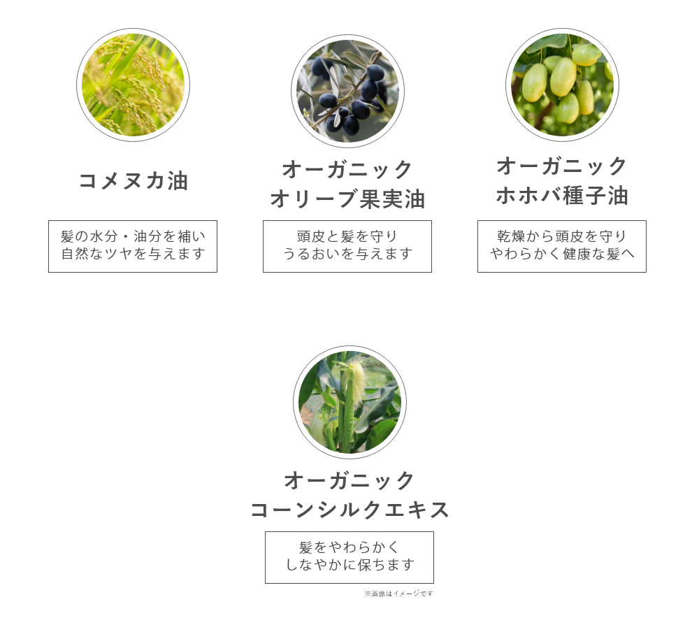 コメヌカ油と3種の植物油が髪にうるおいを与え、やわらかく、しなやかな、まとまりのよい美しい髪に導きます。