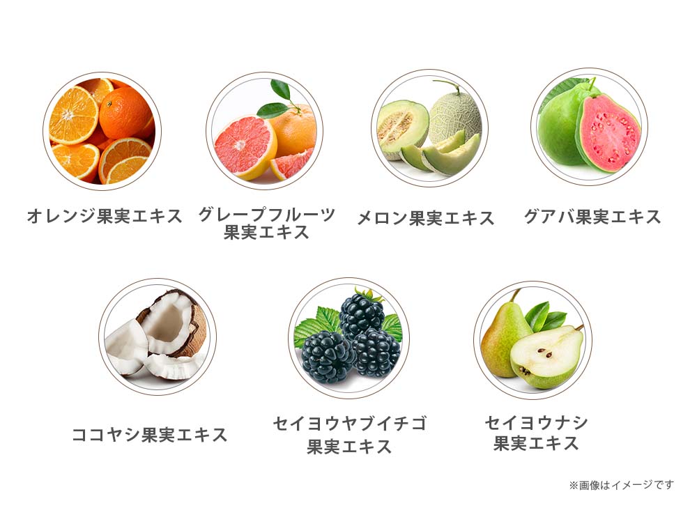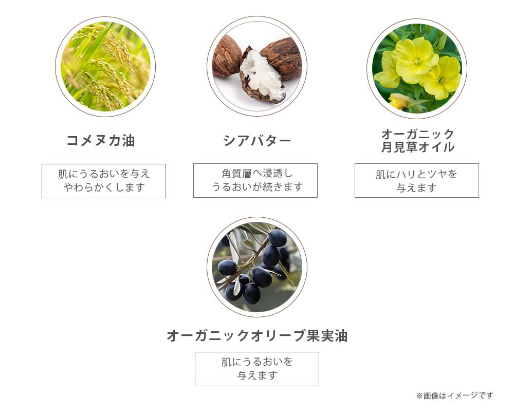水、コメヌカ油、トリ(カプリル酸/カプリン酸)グリセリル、グリセリン、ステアリン酸グリセリル、ステアリン酸PEG-100、セタノール、シア脂、ステアリン酸エチルヘキシル、オレンジ果皮油、ステアリルアルコール、フェノキシエタノール、アルガニアスピノサ(アルガン)核油、月見草油、TEA、レモン果皮油、カルボマー、ステアリン酸PEG-75、グルコン酸Na、乳酸Na、BHT、セテス-20、ステアレス-20、カプリリルグリコール、PG、ユズ果皮油、マツリカ(ジャスミン)花エキス、加水分解乳タンパク、オレンジ花(ネロリ)油、オレンジ果実エキス、グレープフルーツ果実エキス、ココヤシ果実エキス、メロン果実エキス、グアバ果実エキス、セイヨウナシ果実エキス、セイヨウヤブイチゴ果実エキス