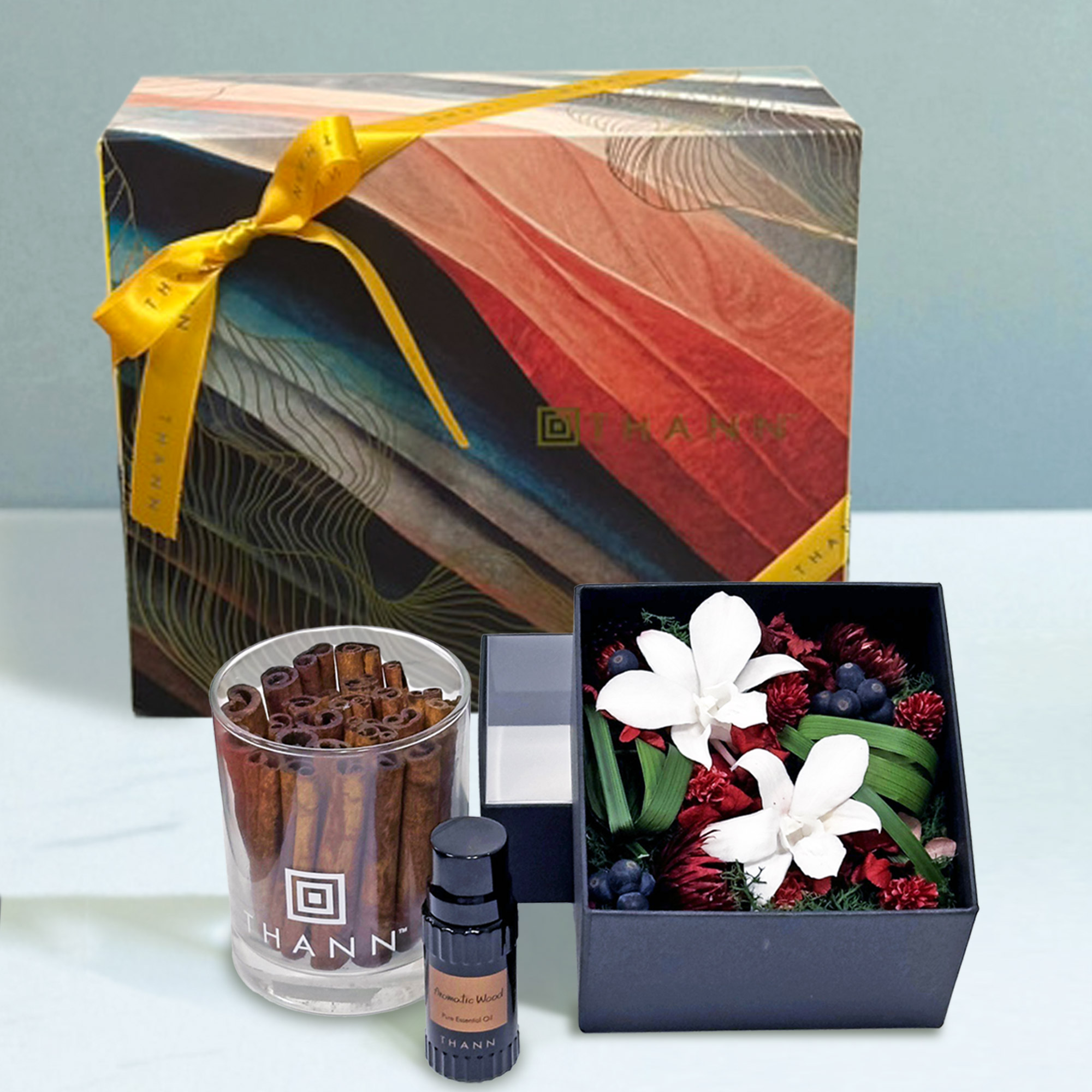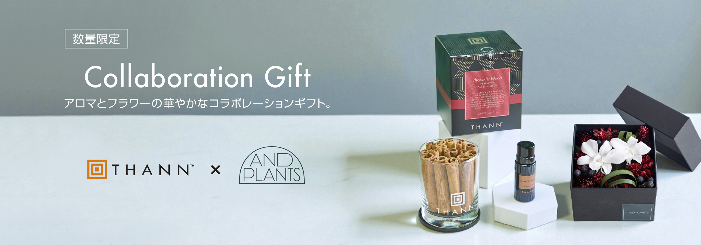 THANN × アンドプランツ コラボレーション限定、特別デザインのプリザーブドフラワーとエッセンシャルオイルのギフトセット。