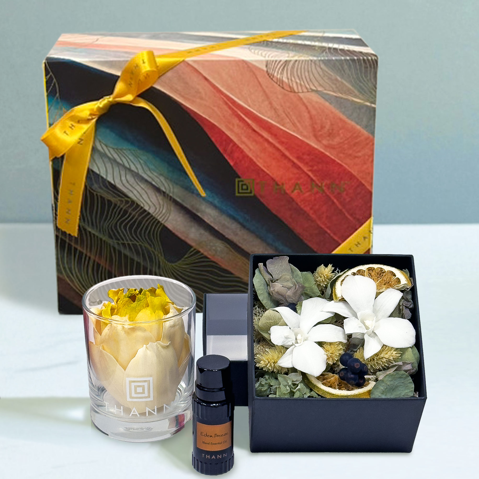 THANN × アンドプランツ コラボレーション限定、特別デザインのプリザーブドフラワーとエッセンシャルオイルのギフトセット。