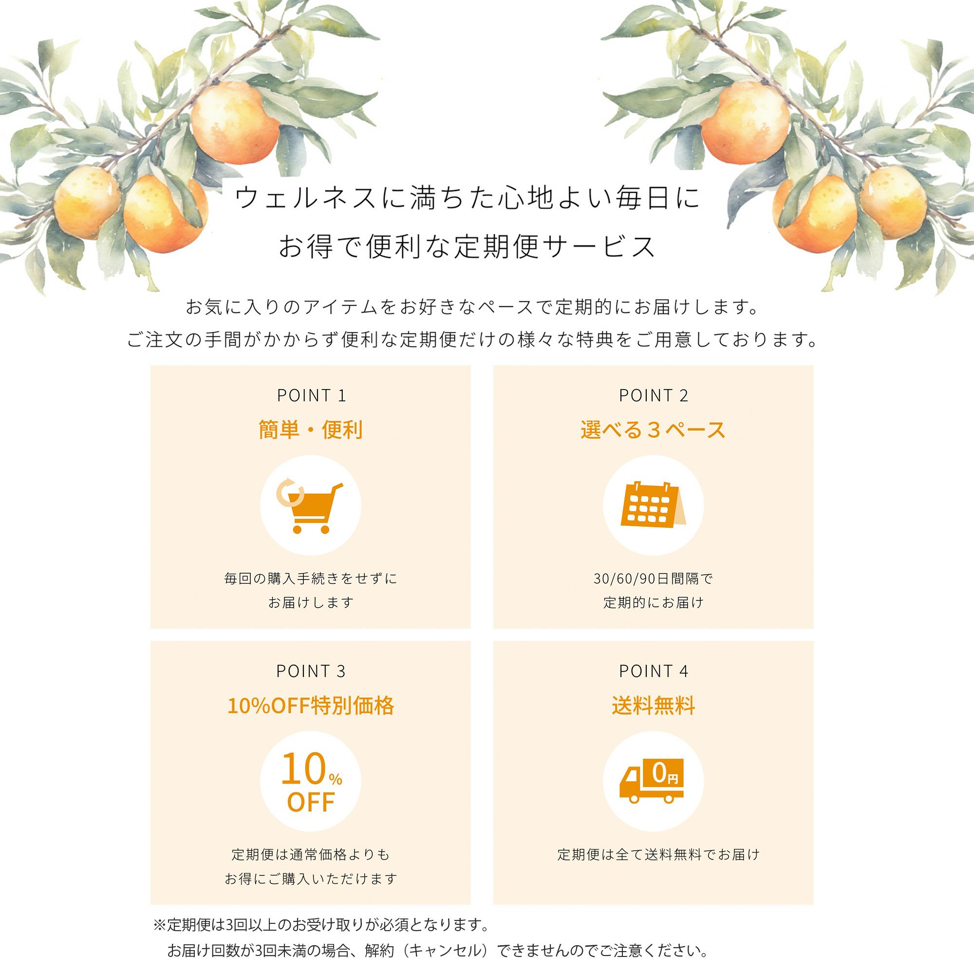 ●定期便は3回以上のお受け取りが必須となります。お届け回数が3回未満の場合、解約(キャンセル)できませんのでご注意ください。 3回目以降の解約(キャンセル)は、マイページからお手続きいただけます。 ●解約のお申し出が無い限り、ご希望いただいた間隔にて商品をお届け致します。 ●お支払いはお届け毎となります。代引き(手数料¥330)、クレジット決済(一括のみ)をお選びいただけます。 ※クレジット決済は、お届け毎にカード利用の確認をカード会社に致します。カードがご利用いただけない場合はお届けできませんのでご注意ください。 ●定期便のご利用は、ご注文者様本人に限らせていただきます。ギフト配送や、代理注文などはご利用いただけません。 ●年末年始や、夏期休業などご希望日にお届けできない場合がございます。予めご了承ください。 ●定期便はマンスリープレゼント対象外となります。 ●定期便のお支払いにポイントはご利用できません。 ●通常商品との同送は承っておりません。 ●次回お届け日の変更、次回お届けのお休み、クレジットカード情報の変更は、マイページ内「定期申込履歴」→「定期申込履歴詳細を見る」にてお届け日の10日前まで可能です。 ●次回お届けサイクルの変更は、マイページ内「定期申込履歴」→「定期申込履歴詳細を見る」にてお届け日の10日前まで可能です。受注確定日当日のサイクル変更は出来ません。また、次回のお届けがスキップされている場合もサイクル変更ができません。 ●お届け先は、お届け日の10日前まで変更が可能です。 マイページ内「会員登録内容変更」に変更先住所をご入力いただき、「継続中の定期・頒布会販売のお届け先情報も変更する」にチェックを入れてご登録ください。 ●デザインなど仕様が変更となる場合がございます。 【お支払い方法の変更について】 ●クレジットカードから代引きへ変更をご希望の場合は、お問い合わせフォームよりご連絡ください。 ●代引きからクレジットカードへの支払い変更は出来ません。一度解約いただき、再度お申込みいただく必要がございます。
