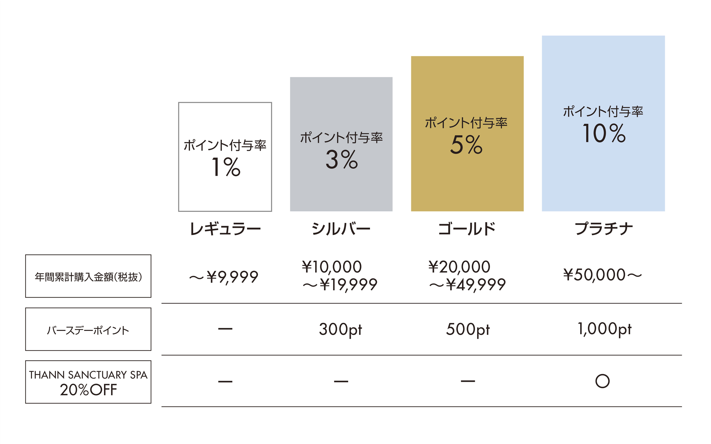 THANN公式オンラインショップおよび直営店舗での1年間の累計購入金額(税抜)に応じて4つの会員ステージをご用意しており、最大10%のポイント付与、バースデーポイントもステージごとに異なります。