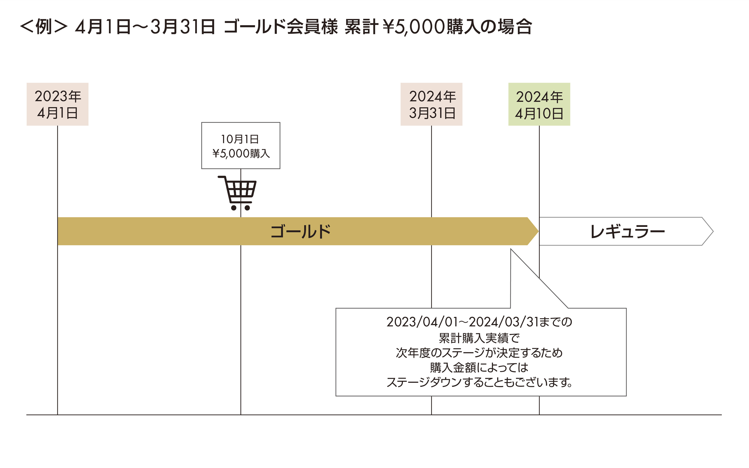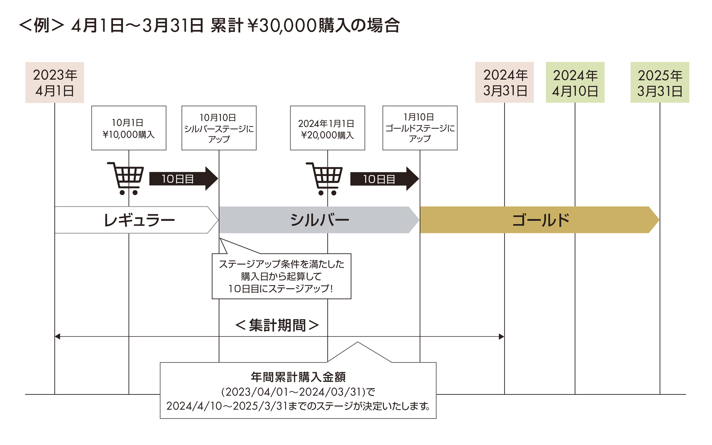 毎年4月1日~翌年3月31日までの1年間をステージ判定期間とし、判定期間における累積購入金額に応じて翌シーズン(翌年4月10日~翌々年3月31日までの1年間)のステージが決まる方式を取らせていただきます。